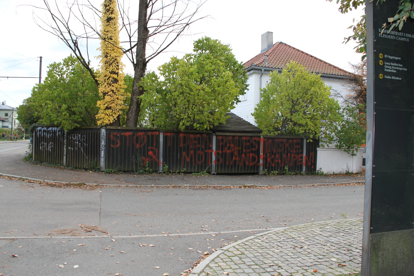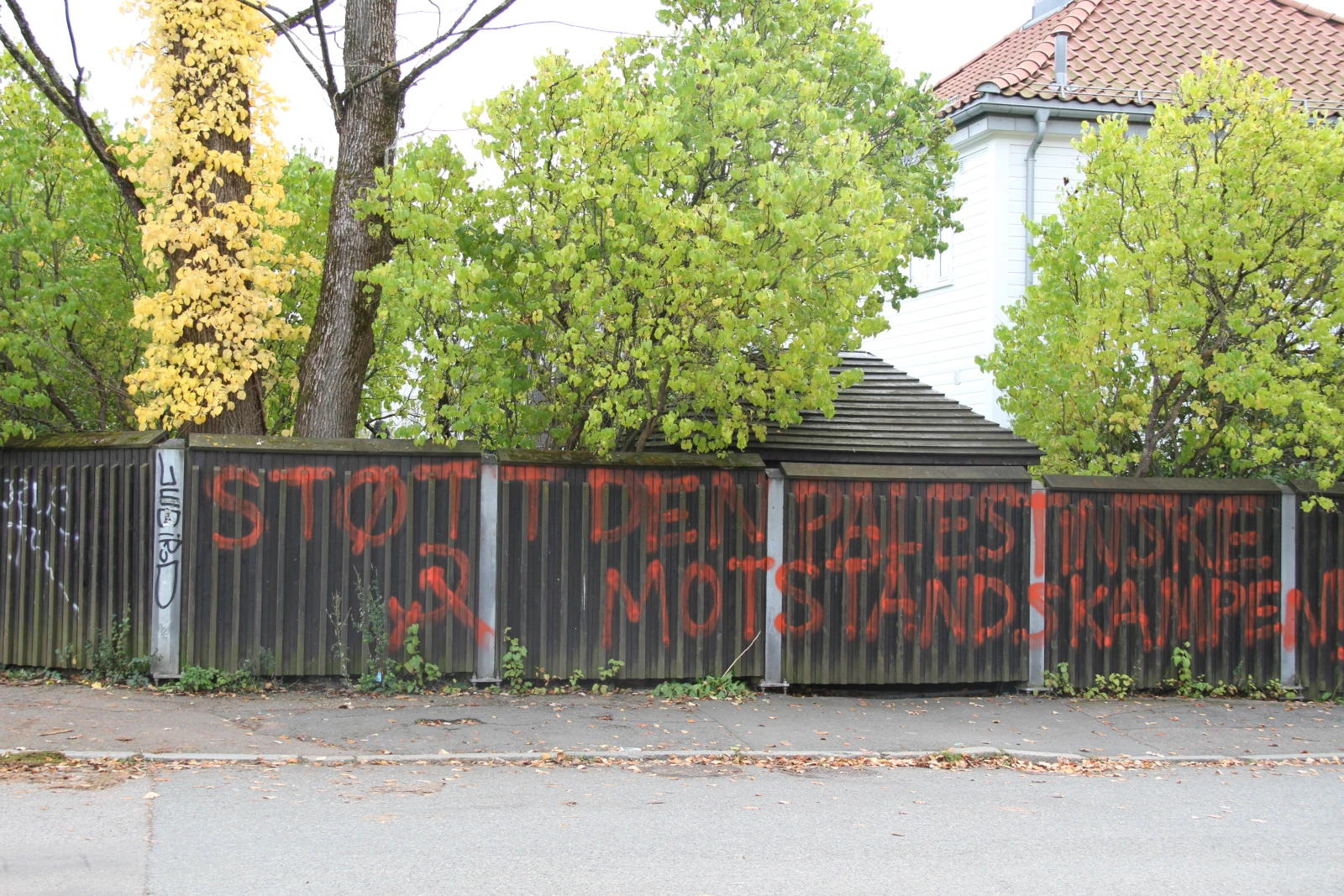 Slagordet «STØTT DEN PALESTINSKE MOTSTANDSKAMPEN!» skal natt til lørdag ha blitt malt i umidelbar nærhet til universitetet Blindern og John Colletts Plass.