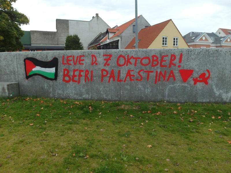 Kameratene raporterer at de har òg mottatt bilder av et veggmaleri ved parkken Karolinelund der det står: «Lenve den 7. oktober!» og «Befri Palestina», samt et motiv av det palestinske flagget.