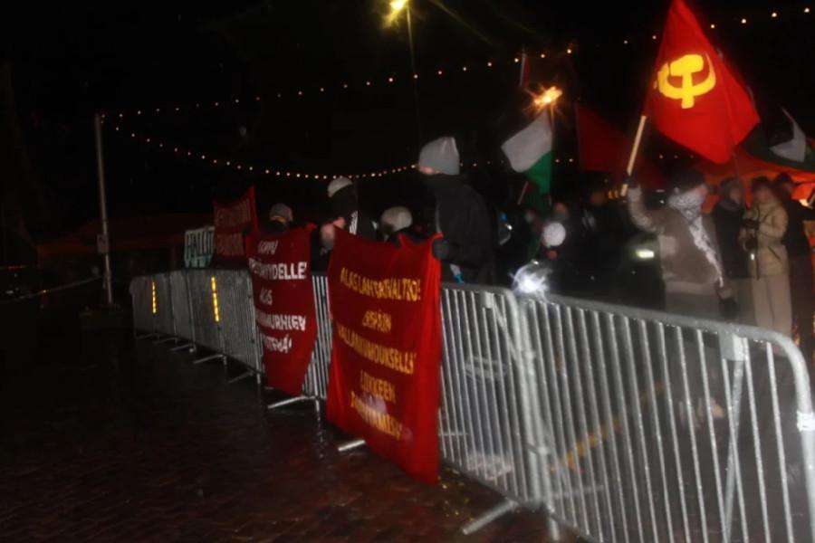 Politiet var sterkt til stede ved presidentpalasset. Ifølge rapportene vi mottok, var det rundt 15–30 politifolk og grensevakter til stede. Det ble også observert kjøretøy fra militærpolitiet i området rundt. Gatene som fører til Kauppatori var sperret av politiet. Etter en halvtime omringet politiet den fredelige demonstrasjonen og krevde at den skulle oppløses uten noen begrunnelse. Demonstrantene trakk seg da tilbake på en kontrollert måte uten tap. Forsamlingsfriheten er en grunnleggende rettighet, og folket har rett til å utøve denne rettigheten uten tillatelse fra politiet, selv om politiet ofte hevder noe annet. Den vilkårlige oppløsningen av en helt fredelig demonstrasjon som kritiserte den finske staten og de stadig forverrede levekårene for folket med trusler om vold, viser hva det borgerlige demokratiet egentlig er, den «friheten» som finsk imperialisme skryter av, og som den hevder å ha forsvart under andre verdenskrig sammen med Nazi-Tyskland mot Sovjetunionen.