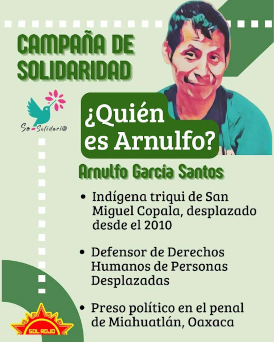 Folkets Strømning – Røde sol, sammen med sivilsamfunnsorganisasjonen «Se solidari@», som står i spissen for hans juridiske forsvar, oppfordrer derfor til en SOLIDARITETSKAMPANJE MED KAMERAT ARNULFO. Informasjonen finnes i bildene i denne artikkelen. Frigjør Arnulfo García Santos! Frigjør politiske fanger!