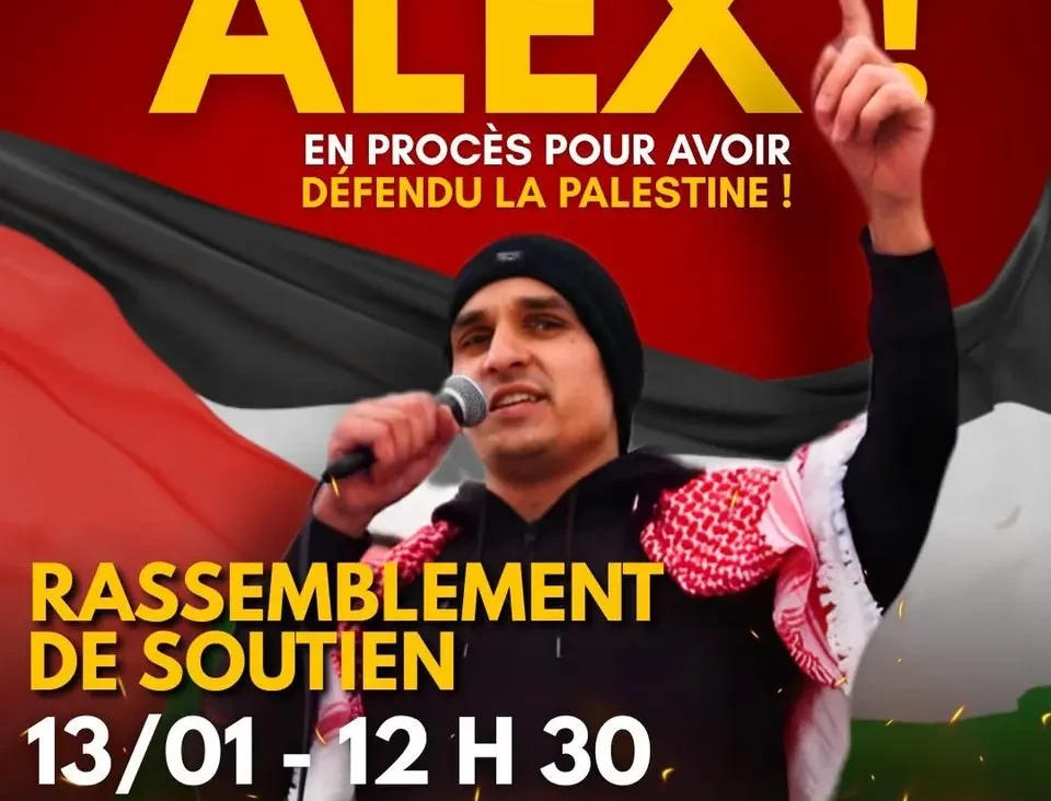Red Herald skriver at Alex, en pro-palestinsk aktivist i Frankrike, straffeforfølges for sine ytringer til støtte for den palestinske motstandskampen. 13. januar i år skal rettsaken mot han holdes, der han anklages av den franske staten for «glorifisering av terrorisme». I den sammenheng kommer det til å være en felles markering til støtte for Alex i Paris.