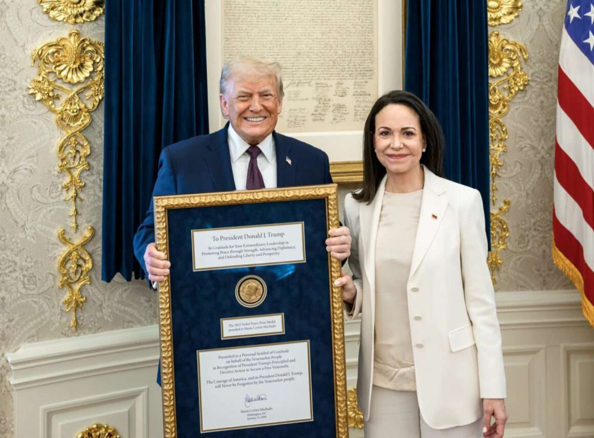 Torsdag 16. januar overrakte Maria Corina Machado, en lakei for amerikanske interesser i Venezuela, sin latterlige «Nobels fredspris» til sin imperialistiske herre Donald Trump. Den groteske scenen med underdanighet fant sted under en seremoni i Det hvite hus, tre uker etter bortføringen av Venezuelas legitime president Nicolás Maduro og hans kone Cilia Flores. Samtidig ble det iscenesatt en farseaktig rettssak for «narkotikasmugling», etter den lynraske aksjonen som bombet den venezuelanske nasjonen 3. januar.