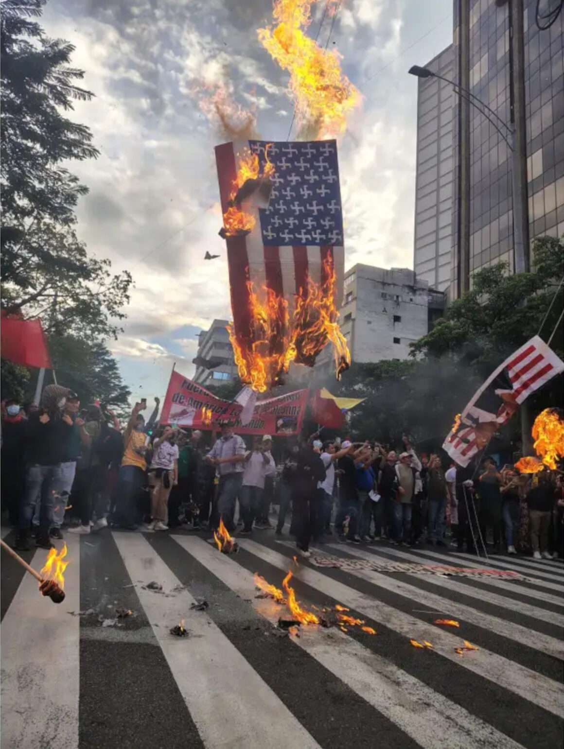 I Medellin samlet en demonstrasjon hundrevis av mennesker. Det ble laget graffiti, og et amerikansk flagg med ansiktet til den reaksjonære Donald Trump ble brent.