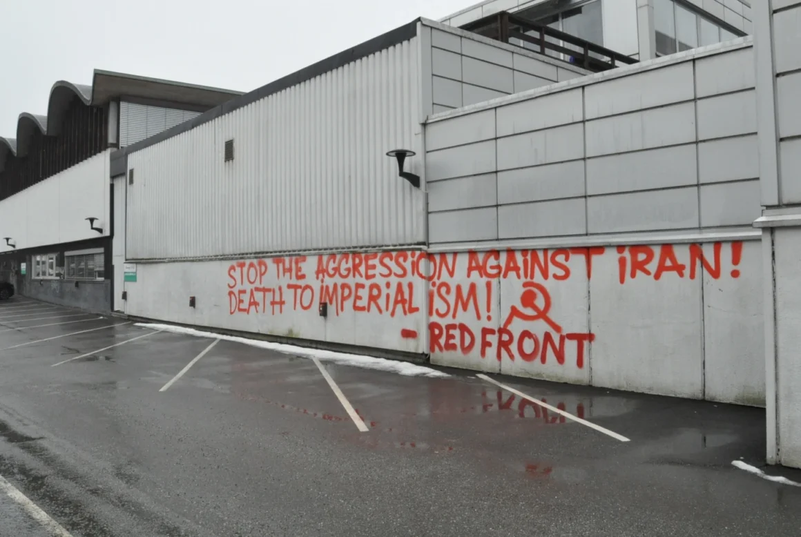 På ett sted skal aktivistene ha malt slagordet «Stop the aggression against Iran! Death to imperialism!», og på et annet sted slagordet «Stop operation Kagaar! Støtt folkekrigen i India!». Begge steder flankert av hammer og sigd, og signert Rød Front.
